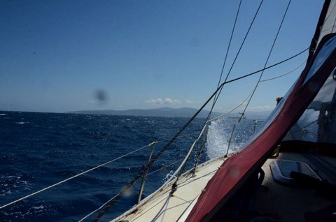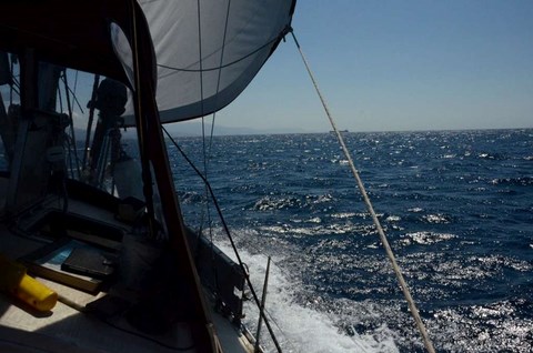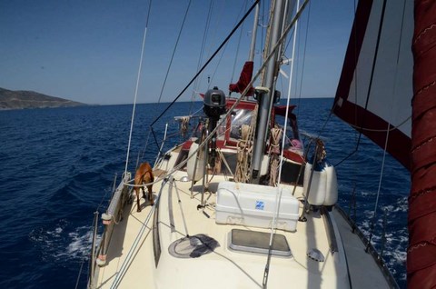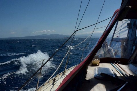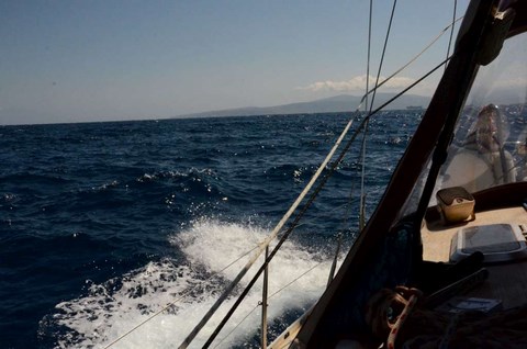 Depuis 8 heures ce matin, Samedi 29, nous sommes en route pour Ikaria, où nous ne sommes jamais allé, toutes voiles dehors au près bon plein, sur mer absolument plate, aux alentours de 6 noeuds, tranquilles comme Baptiste. Le peid intégral.