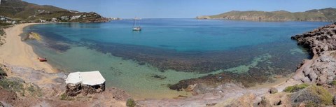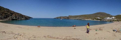 On continue à profiter du petit vent de Sud pour aller découvrir un nouveau mouillage, Panormos, sur Mikonos: MA-GNI-FI-QUE, en tout cas, hors saison, puisque cette baie est, d'aprés les guides, LA baie des véliplanchistes en été. Avec les vedettes et les jet-skis en prime, tout un programme qu'on est bien contents d'éviter ( on a quand même eu UN jet-ski qui a fait le tour du bateau à 100km/h!)