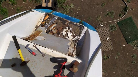 Alors, je l'ai consulté aussi. Et il m'a dit, en substance et en grec : " C'est pourri. Laisse moi faire, c'est rien du tout! " Allez hop, un problème de résolu : On a tout arraché et mis à sécher. Heureusement, c'est superficiel et la coque en elle-même est parfaitement saine: