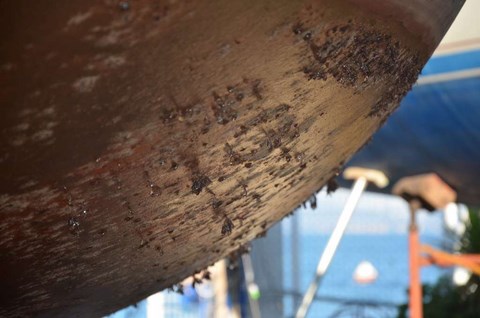 Il n 'est pas trop sale, cette année, le Troll, exceptés ces damnés coquillages qui sont décidémet bien tenaces. Du reste, là où il y en a le plus, c'est sur l'hélice, véritablement atteinte d'un exéma purulent alors que le reste de la coque n'est pas si atteinte, preuve que le Velox semble mal vieillir en pot. Vous noterez également la véritable forêt de bateaux à terre: