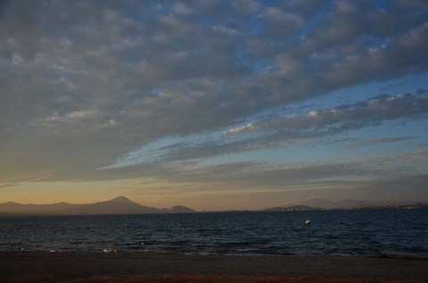 Le 24, le Père Noël, un peu en avance, nous a apporté le soleil. Du coup, on est allé se promener, hélas, sans Inou qui ne voulait visiblement pas venir avec nous. Nous avons pris les autos et sommes allés à deux ou trois kilomètres, vers le cap, "gardé" par un hotel abandonné, sans doute de l'époque des colonels, avec son immense piscine délabrée: