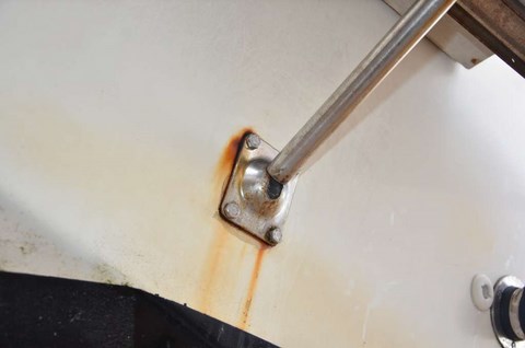 Il faut dire que l'inox qui la constitue a pas mal souffert de l'usure du temps et que des coulures de mauvaises augures débordent de ses fixations :