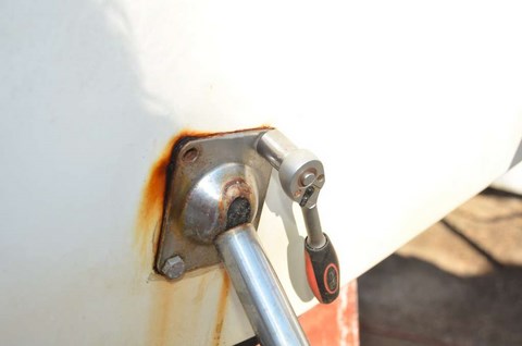 Le problème, c'est (c'était) que la fixation inférieure, en photo au-dessus, est totalement inaccessible de l'intérieur, car les écrous sont derrière une cloison, derrière le secteur de barre :