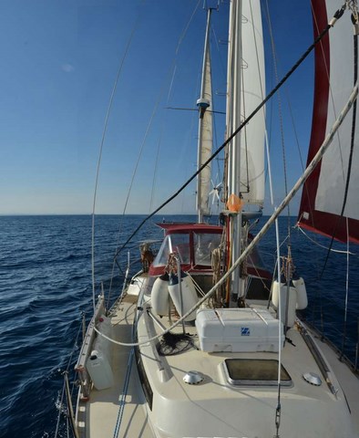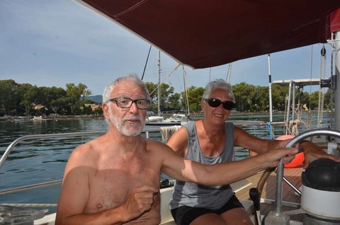 Ce sont Lucette et Jean-Pierre, adorables, qui naviguent sur un EVASION 37 PRESTIGE ( ça change tout ! Non, en fait rien, si ce n'est un peu de teck en plus, un peu d'ébénisterie supplémentaire et que c'est un des tout derniers 37 sortis de chez Beneteau!)