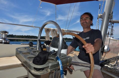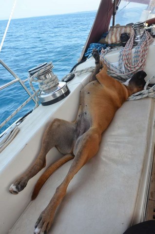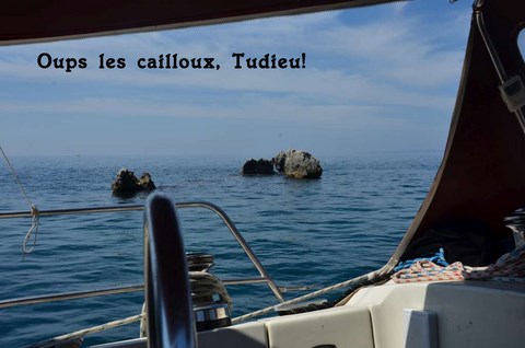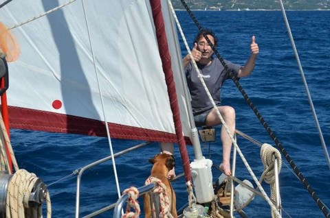 Alors, prédestiné, le surnom du bonnet rouge? Ben je sais pas, mais ce que je sais, c'est qu'on a tout fait à la voile et que, skipper débutant, Zeff s'en est sorti comme un grand. Au bon plein comme au travers par un bon 4à 5, très peu d'erreurs, un bon ressenti à la barre. Non, rien à dire, parfait ! Apparemment, ça lui a bien plu :