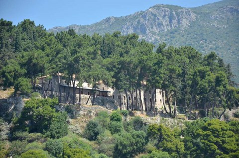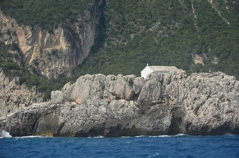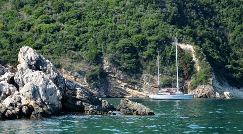 On s'apprêtait à passer la nuit ici. Bon, c'était un poil houleux, mais bon. On avait prévu d'aller manger au village le soir. C'était sansd compter un mail de Nicolas et Siri, qui vaient enfin remâté leur bateau et qui nous demandaient où on était, alors qu'ils étaient à sivota/Mourtos, 13 milles plus au nord. Comme c'était quand même houleux, qu'on avait super envie de les voir et que le vent paraissait tomber, hop, on a levé l'ancre. las, on va faire les 13 milles vent (15/20 noeuds) et vagues dans la gueule, Et, vu l'heure, pas quesrion de tirer des bords ! On est arrivés fourbus mais heureus en baie du monastère où nous étions tant fait secouer au début du mois dernier !
