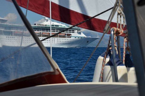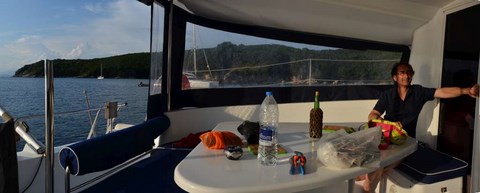 Bon, c'est pas aussi moche que je le décris, mais, au bout de bientôt 9 ans dans ces eaux, on est devenus très difficiles. On pioche quand même, là où on peut et on décide de se faire une petite taverna. Las, elles sont toutes super chers ! On change de projet et l'on fait des courses pour une salade express à bord, express car pas question de passer la nuit là !