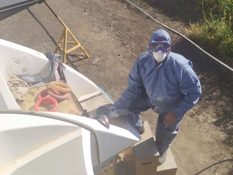 Le temps était au beau fixe ! Il permettait toutes sortes de travaux : Ponçage, reponçage, dépoussiérage, peinture, gel coat, stratification, etc !