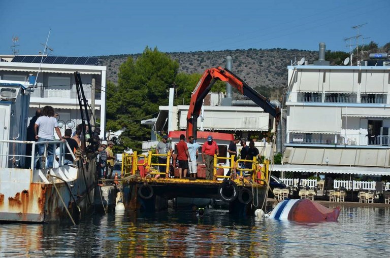 Au loin passe la barge qui a retiré les deux voiliers coulés au port de Poros