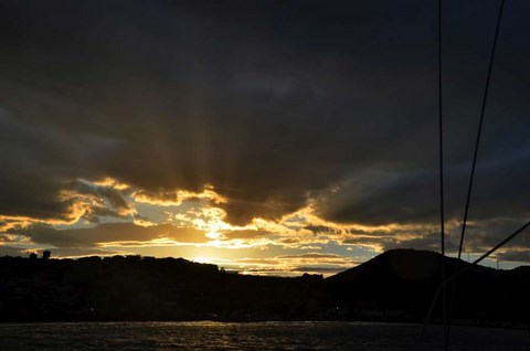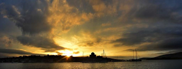 Le dimanche, on passe dire au-revoir au DEFER, qui ont bien abimé leur jupe à Nafplio ( ça a castagné pas mal là-bas aussi. TOUS les bateaux au quai ont tapé!) et on part pour ERMIONI. Mi voile mi moteur, la nav' est sympa. Pas grand monde à Kiladha, juste un beau coucher de soleil: