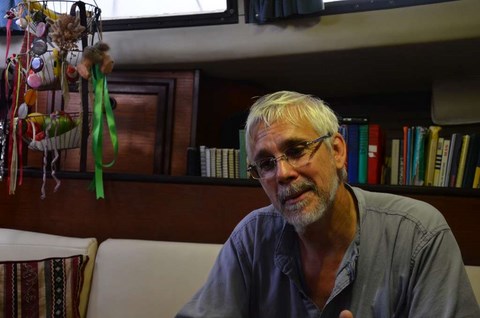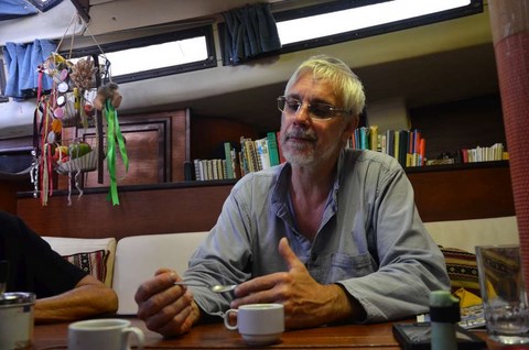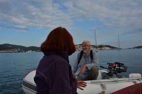 Surprise, nous retrouvons, dans son annexe, notre..."voisin de ber" du chantier de Chalkoutsi: Le délicieux Michael, terriblement ( et joyeusement) britannique, jusqu'au bout de l'humour.