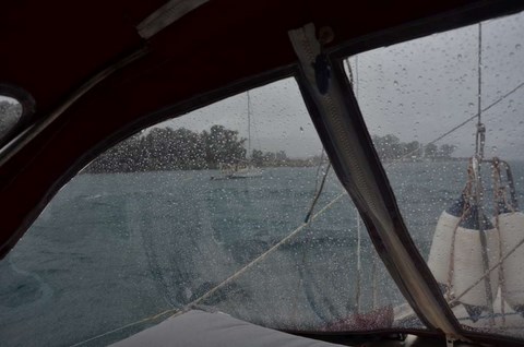 Je retourne comme je peux dans le carré. Françoise a réussi à défaire le taud de soleil. Il ne pleut pas : il cataracte!