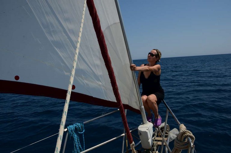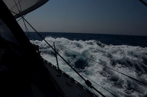 Avec une putain de houle très courte, chiante au possible. Pas grave. On met les voiles et on commence à tirer péniblement des bords. Après tout, on n'a que 15 milles à faire.