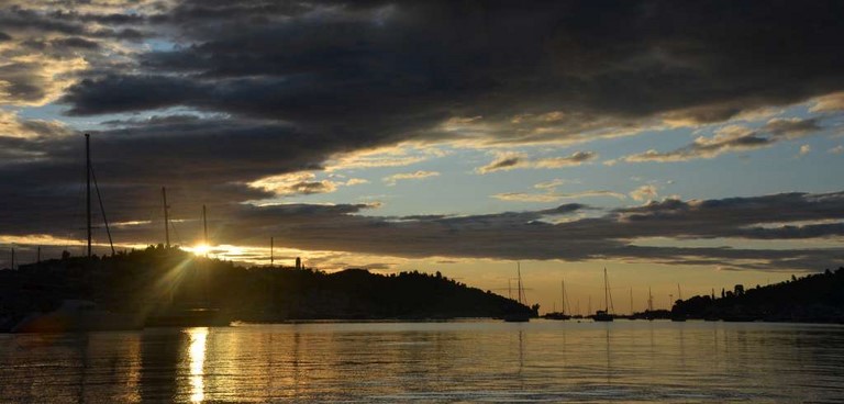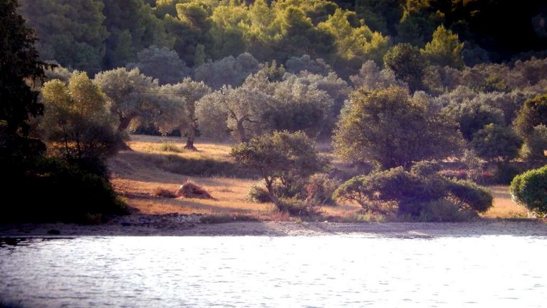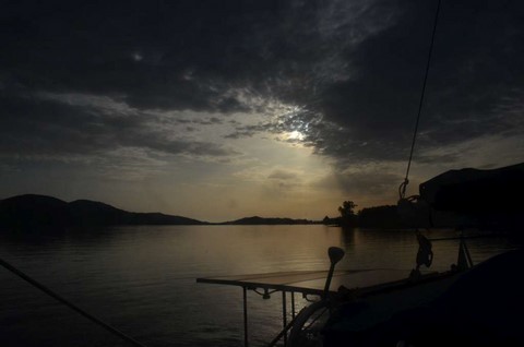 Du 27 septembre au 9 octobre, on a mouillé, avec bonheur, devant "notre" petit bois d'eucalyptus. Temps splendide, que du bonheur, et puis, ça s'est un poil gaté ! PArce que, là-bas, on s'est pris un genre de rincée que réserve parfois la Grèce ! Une bassine d'eau renversée direct sur la tronche. j'ai récupéré plus de 200 litres de flotte dans l'annexe en moins d'une demi journée !