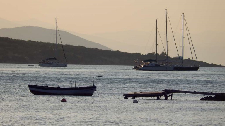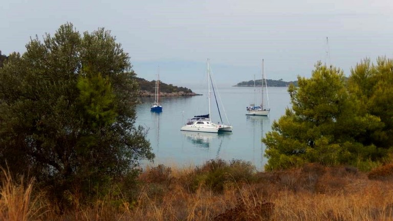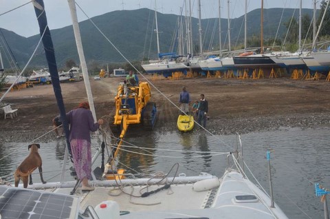 Et puis, l'impossibilité pour Françoise de se promener, le début des pluies diluviennes d'automne, le vent dans la baie, et l'envie d'avoir le temps avant de quitter la Grèce, nous ont décidés à demander à Daniela et Michaelis de sortir notre petit cata.