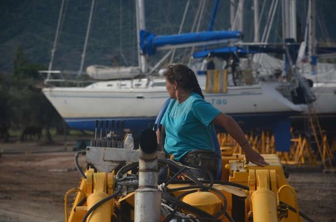 Contrairement à ce que pourrait laisser croire la dernière image, et même si Daniela sait ajuster les vérins avec talent, c'est quand Michael qui fait la manoeuvre de sortie, pendant que Daniela filme :