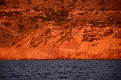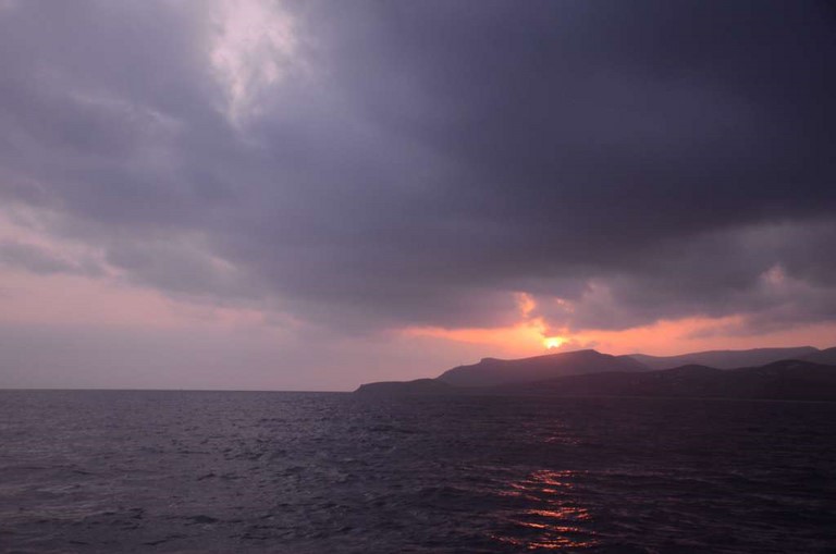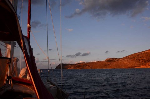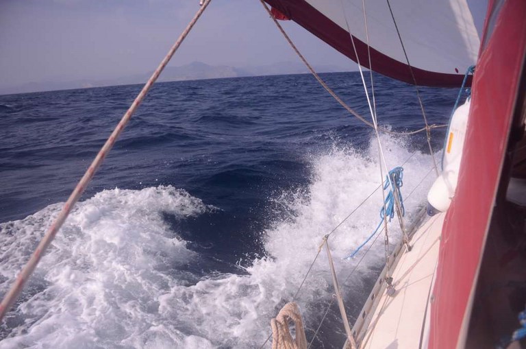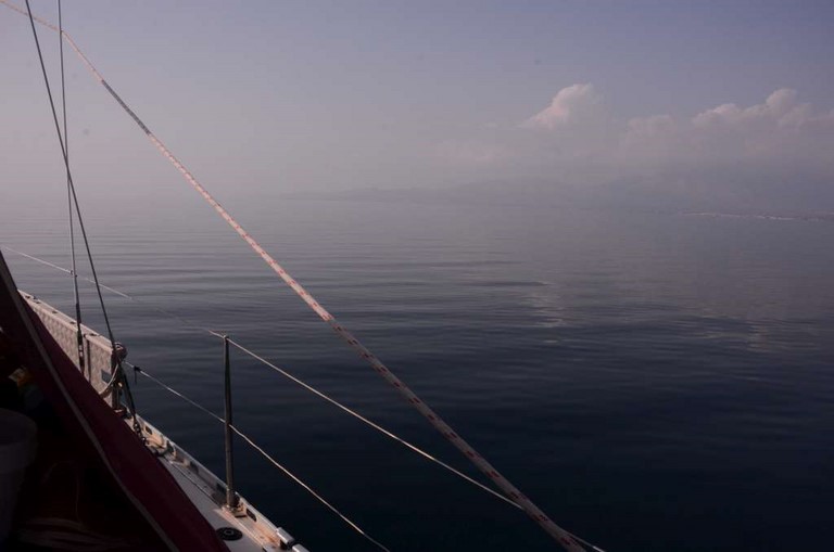 ENFIN ! La météo semble un peu plus clémente. Je mets les voiles et en route pour Finikas. Je sais déjà, toutefois, que je vais être bloqué aussi là-bas, mais ce sera encore un bout de fait. La nav' est assez pénible, avec bien peu de vent et pas mal de houle ! Décidément, les Dieux ne sont pas avec moi. Ca tombe bien, c'est parfaitement réciproque: