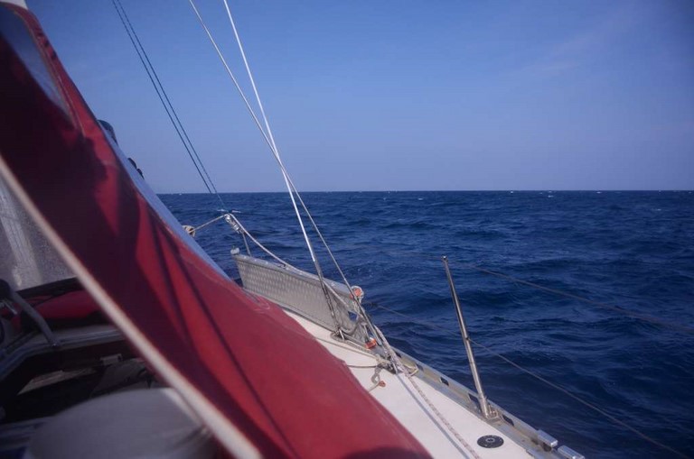 Par chance, un peu de vent se lève, de travers. Je déroule le génois et j'arrête le moteur. J'avance à 2 noeuds.