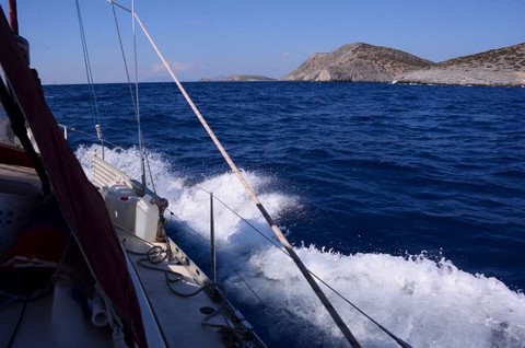 Bientôt me voici à Levitha, seul bateau à la bouée. Du coup, personne pour m'aider à la prendre, mais j'avais préparé un lasso au taquet du milieu, ramené à moi, ce qui fait que je la prends du premier coup !