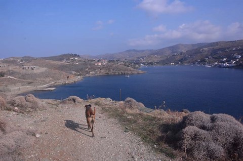 On devait se retrouver à Batsi, mouillage de la côte NE de Kéa, avec les copains de Manahiki. Mais, ils y arrivent avec une demi-heure d'avance sur moi et me préviennent, par téléphone, que le mouillage est bien houleux. Du coup, je rajoute 7 milles à ma nav', qui en comptait déjà beaucoup trop, pour rallier Vourkari, sur la côte Ouest de Kéa. Je ne le dis pas à Javotte, j'ai peur qu'elle me morde ( elle a été exemplaire et adorable pendant ces épreuves).