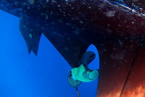 Un bout de bâche, ou un vieux sac perturbe mon hélice. Mais ça n'a pas l'air trop trop méchant. Ma marche arrière a dû en enlever un bon bout.